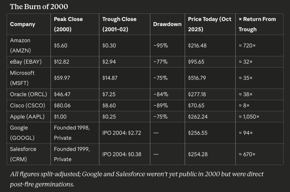 2000年那场野火几乎是一次彻底的焚毁。过度建设的基础设施、泛滥的资本和投机狂热一起,把几乎所有“无利润的增长故事”都烧成了灰。但留下来的,是根系:数据中心、光纤网络,以及那些学会“长得慢、扎得深”的幸存公司。