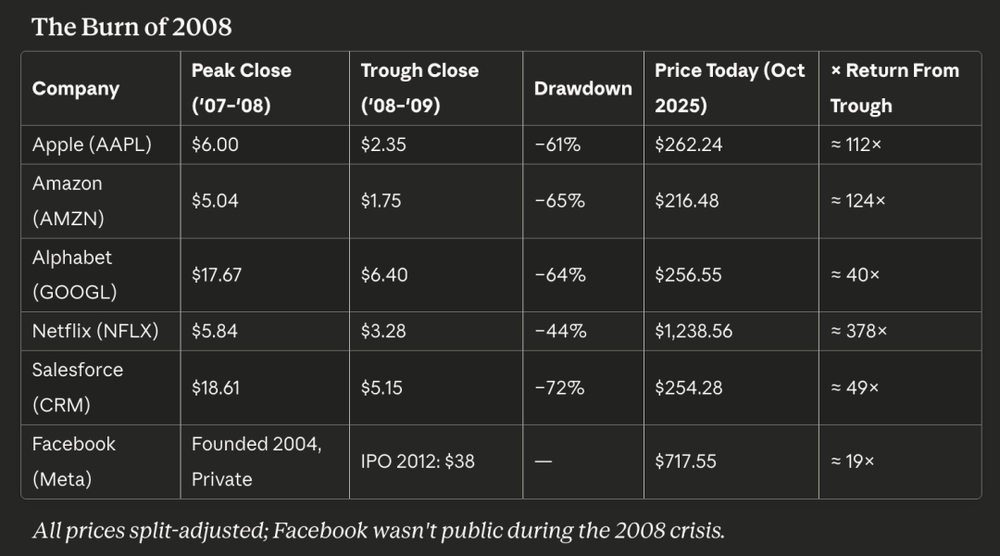 苹果在逆境中走向主导,把iPhone从一个新奇玩意变成社会基础设施。亚马逊在熬过了互联网泡沫的炼狱之后,悄然成为互联网的氧气供应商:AWS。Netflix为流媒体时代重塑自我,它的增长字面意义上跑在上一轮泡沫铺下的光纤之上。Salesforce证明了即便资本开支被冻结,云软件依然可以茁壮成长。谷歌发现,可度量的效果广告在衰退中仍然可以扩张。而那时还只是幼苗的Facebook,很快就在灰烬中扎根,依靠廉价智能手机和过剩带宽滋养。