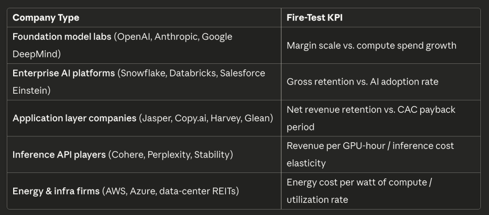 贯穿这些指标的元模式是:它们都在从不同角度追问同一件事——当外部资本消失,你的商业模式还能自我维持吗?耐火的公司实现了一种“热力学上的可持续”:每一单位投入(资本、算力、电力)都能产出超过一单位的回报(收入、价值、效率),于是它们能在稀缺环境中照样成长。而那些易燃的“灌木丛”,消耗的总是多于创造的,只是靠充裕资本补贴撑着,一旦补贴消失,它们就会被点燃。