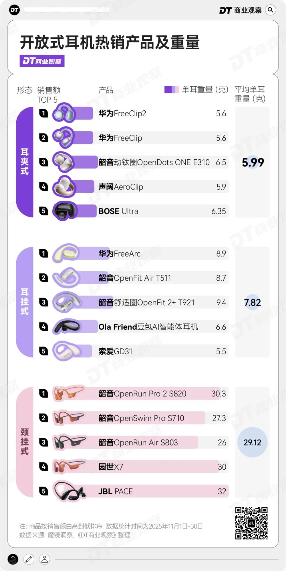 对比开放式耳机热销产品,耳夹式耳机单耳重量约6克,约等于一张A4纸的重量,将存在感降至最低,耳挂式耳机平均重量在7-8克,而颈挂式耳机更重,大约为30克。