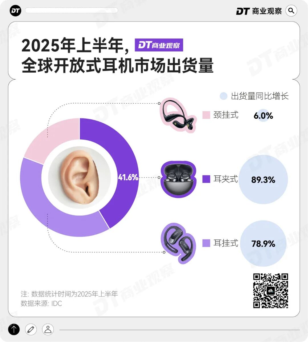IDC数据显示,2025年上半年全球开放式耳机出货量同比增长61.1%。其中,最年轻的耳夹式耳机出货量占比41.6%,同比增长89.3%,不仅跑赢大盘,也跑赢了耳挂式耳机(78.9%)和颈挂式耳机(6.0%)。