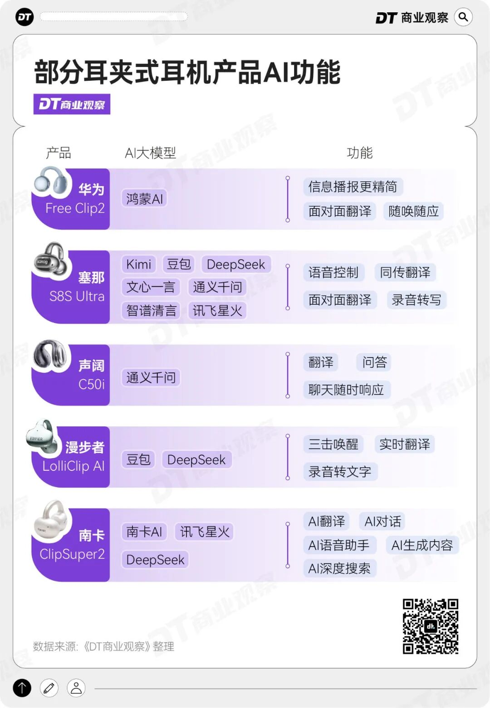 例如,华为FreeClip 2搭载鸿蒙AI,小艺语音助手随唤随应,支持面对面翻译;塞那S8S Ultra集合七大AI模型,覆盖实时录音转写、语音智聊对话、面对面翻译等需求;声阔C50i集成通义千问大模型,实现翻译、问答、聊天的即时响应。