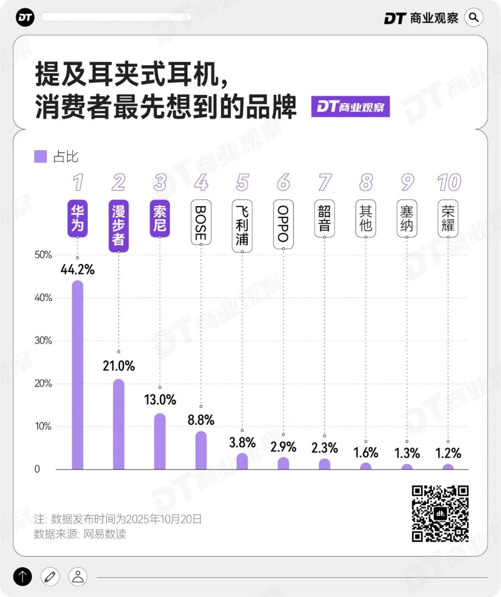 2025年10月,网易数读发布的一则数据显示,提到耳夹式耳机,44.2%的消费者最先想到的品牌就是华为,这意味着华为已经将品牌与“耳夹式耳机”这一品类深度绑定,完成了关键的市场教育。