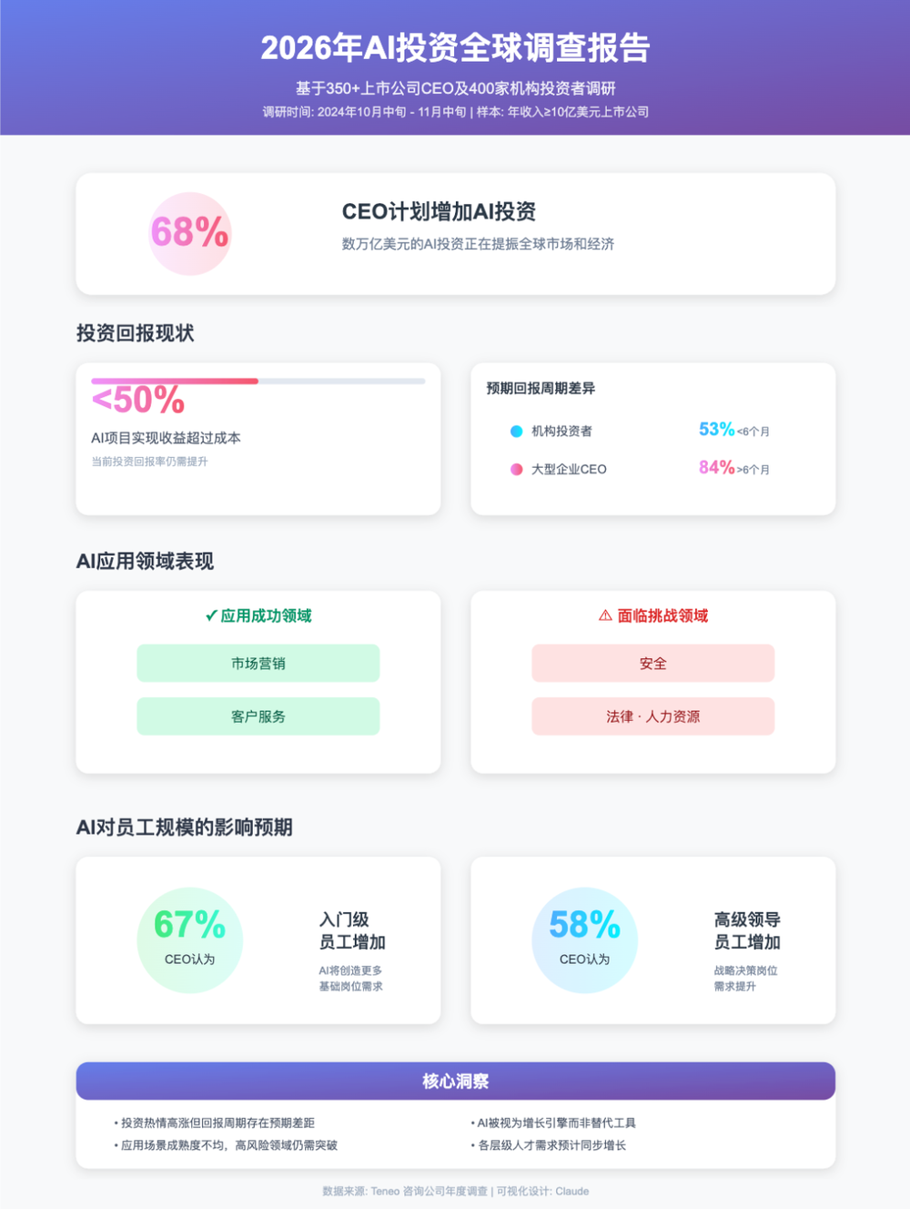 咨询公司Teneo调查了350位年营收超过十亿美元的上市公司CEO,针对有关于AI的支出(CapEx)等关键问题做了调研,得出了一份非常具备参考性,同时也在某些方面与大众认知出现反差的信息报告。