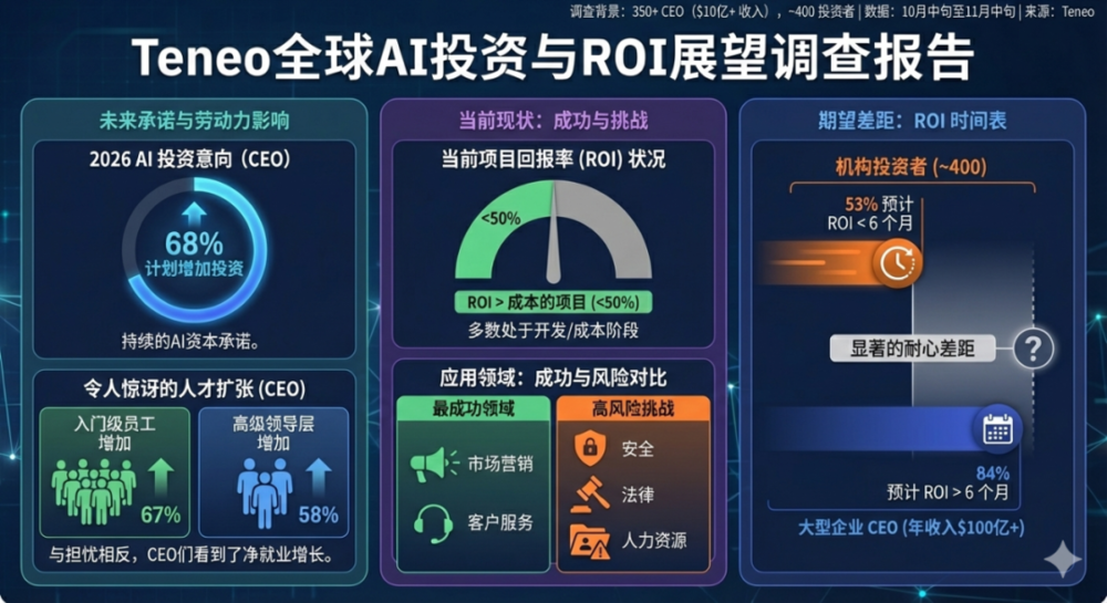68%的CEO计划在2026年增加AI支出,受访者同时表示目前的AI项目只有不到一半产生了超过支出的回报。CEO们称,AI在市场营销和客服领域应用最成功,在安全、法律和HR等高风险领域面临挑战。