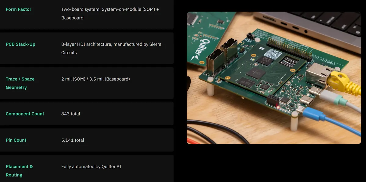 通常情况下,设计这样一款复杂的 PCB 电路板,需要耗时约 3 个月,而 Quilter 仅耗时一周即宣告完成。更为关键的是,该原型机在制造完成后,首次上电便成功启动并运行了 Debian 操作系统,未出现任何硬件级错误。