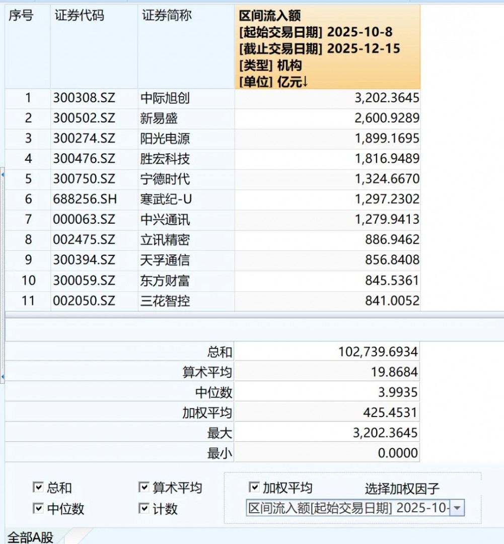 如果再加上中际旭创的3202亿元、新易盛的2601亿元、胜宏科技的1817亿元,这几只AI概念热门股占据了超10%的A股机构资金区间流入额。显然,这就是一种完全、彻底的抱团。