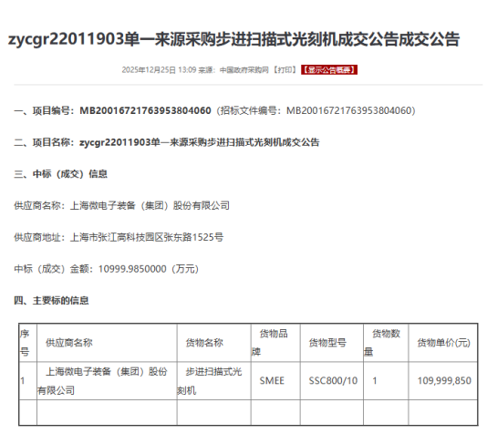 12月25日,一则看似寻常的政府采购公告悄然出现在中国政务采购网上:科学技术部以单一来源方式采购了一台步进扫描式光刻机,中标金额约1.10亿元,中标方为上海微电子装备(集团)股份有限公司(简称“上海微电子”)。货物型号简短而“神秘”——SSC800/10。
