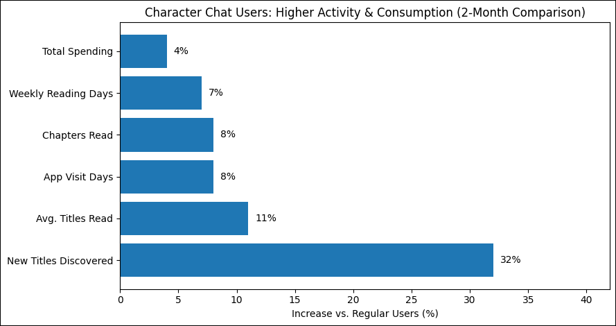 也有数据提到,参与AI角色陪聊的读者,不仅比普通读者更活跃,也更愿意花钱:APP访问天数、每周阅读天数、人均阅读作品数、新接触作品数……差别都非常明显。