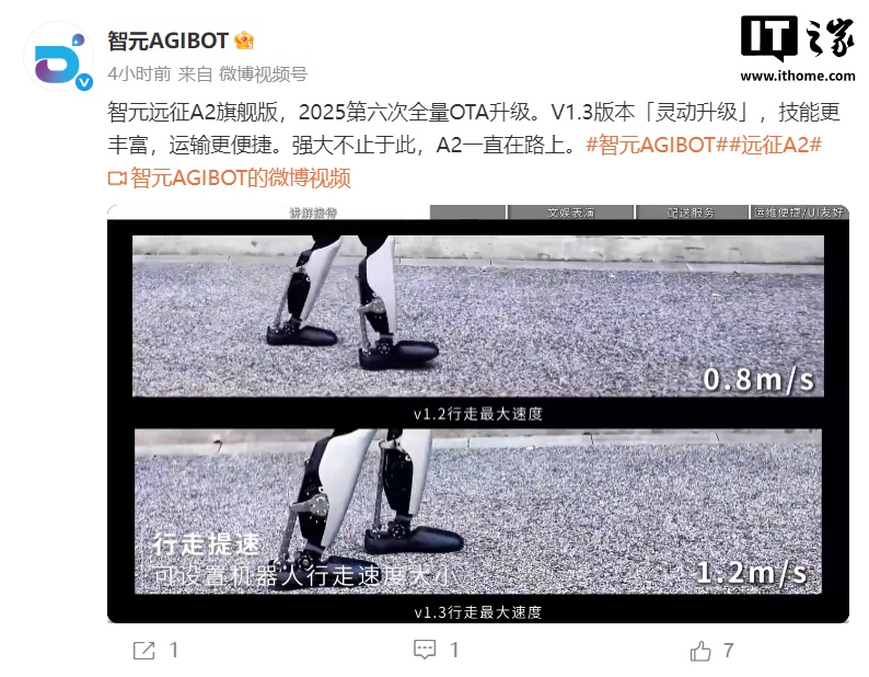 智元远征 A2 旗舰版人形机器人迎来 V1.3 更新,行走速度提升至 1.2m/s