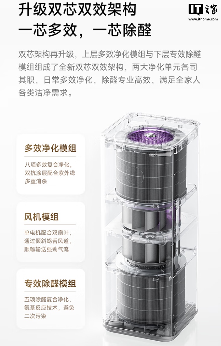 据介绍,小米米家空气净化器 6 Pro 双芯架构得到升级,上层多效净化模组与下层专效除醛模组组成了全新双芯双效架构,搭载多效净化模组、风机模组、专效除醛模组。