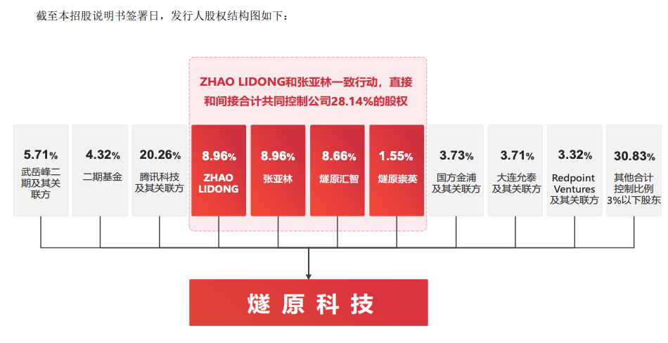 燧原科技创始人及实际控制人赵立东、张亚林合计直接持股17.9287%,通过员工持股平台间接控制公司10.2070%的股权,合计控制公司28.1357%的股权。