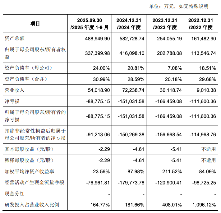 其2022年度、2023年度、2024年度及2025年1-9月归母净亏损分别为11.16亿元、16.65亿元、15.1亿元和8.88亿元,同期研发费用则分别达9.88亿元、12.29亿元、13.12亿元和8.90亿元。