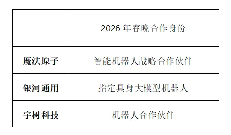 至此,已经有三家机器人宣布与2026年央视春晚达成合作。宇树、银河通用和魔法原子三家机器人公司即将同台竞技。