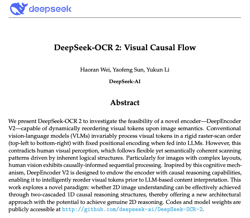 1月27日消息,深度求索(DeepSeek)团队发布了论文《DeepSeek-OCR 2: Visual Causal Flow》并开源了同名模型DeepSeek-OCR 2。这一模型是对去年10月20日发布的DeepSeek-OCR模型的升级。