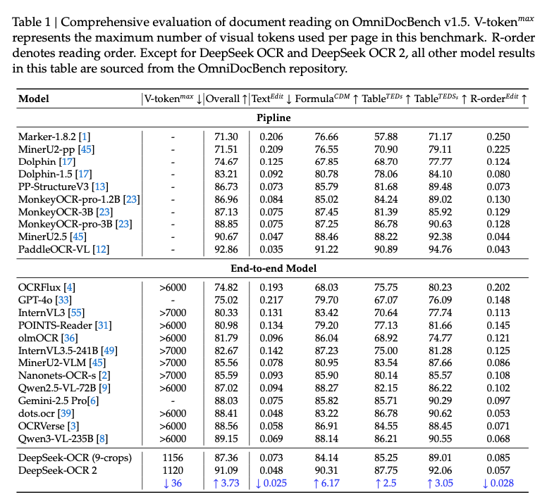 基于“视觉因果流”这一底层创新,DeepSeek-OCR 2展现出了一系列显著优于前代及同类模型的能力。
