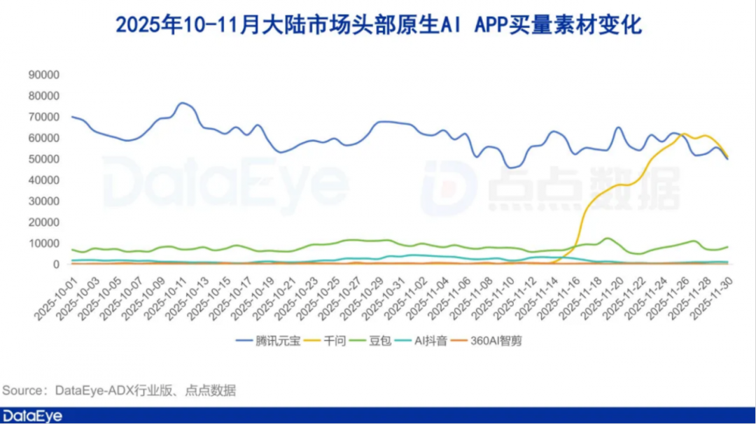 在这之后,Kimi、腾讯元宝、阿里千问轮番登顶“投放之王”。根据DataEye研究院旗下ADX行业版数据,去年11月国内原生AI产品投放素材89.1万组,其中,腾讯元宝占46%、千问占34%、豆包仅11%,豆包的投入强度,大约只有元宝和千问的三分之一。