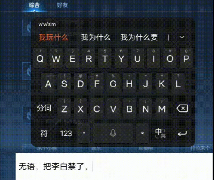 小编体验发现,根据不同场景,最新版搜狗输入法可识别用户的打字意图,把更准确的词排在前面。比如,玩游戏时,用户输入“无语,把李白禁了 wwsm”,模型识别游戏场景和意图后,候选词优先推荐“我玩什么”而不是“我为什么”。