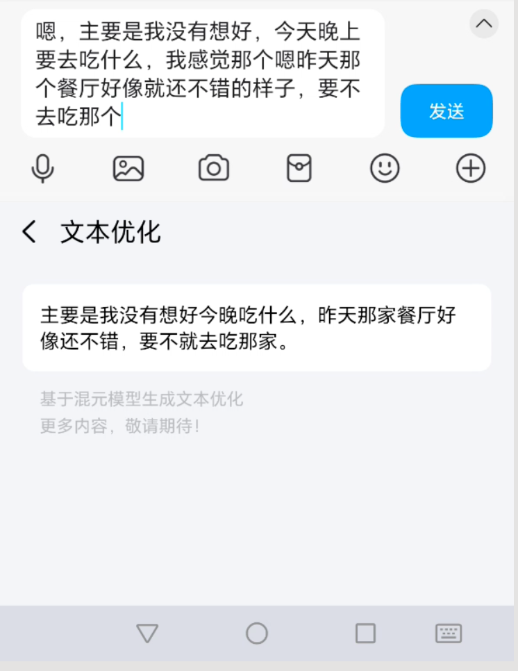 比如,输入“嗯,主要是我没有想好,今天晚上要去吃什么,我感觉那个嗯昨天那个餐厅好像就还不错的样子,要不去吃那个”。优化后的文本为:“主要是我没有想好今晚吃什么,昨天那家餐厅好像还不错,要不就去吃那家。”简洁明了,可以直接做“电子嘴替”了。