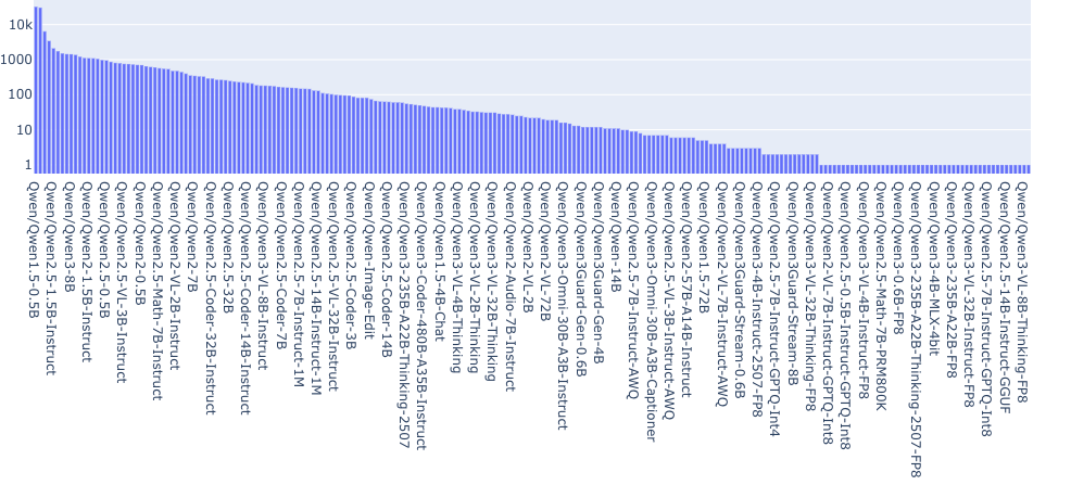 参数规模在5亿到300亿之间的模型更容易在本地运行、进行微调,并集成到业务系统和智能体工作流中。例如,在Qwen系列中,Qwen 1.5-0.5B拥有最多的衍生模型(见下图)。在算力受限或合规要求严格的环境中,这类模型显然更适合长期运行。与此同时,领先机构通常会使用参数规模在100B到700B之间的大型MoE模型作为能力上限或“教师模型”,再将其能力蒸馏到众多小模型中。这形成了一种清晰的结构:顶层是少数超大模型,下层则是大量实用模型。月度统计中小模型占比的上升,反映了社区中的真实使用需求。