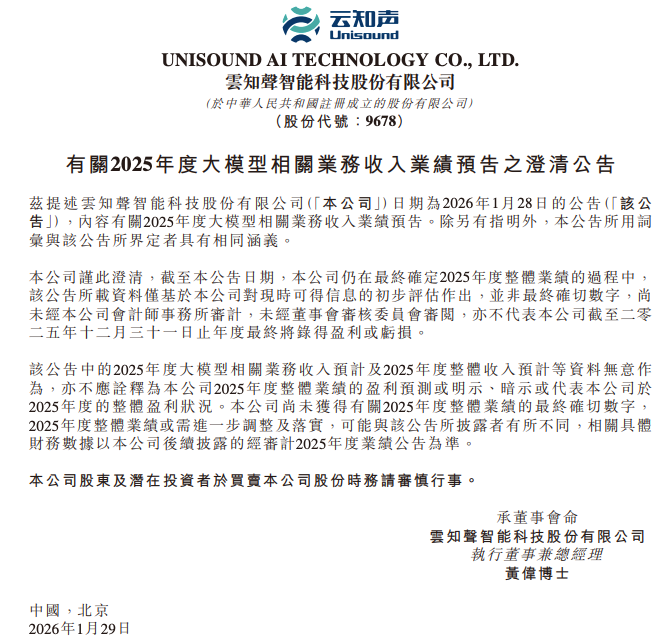 1月30日消息,云知声昨日晚间发布澄清公告,就其前一日(1月28日)发布的2025年度大模型相关业务收入业绩预告作出说明。