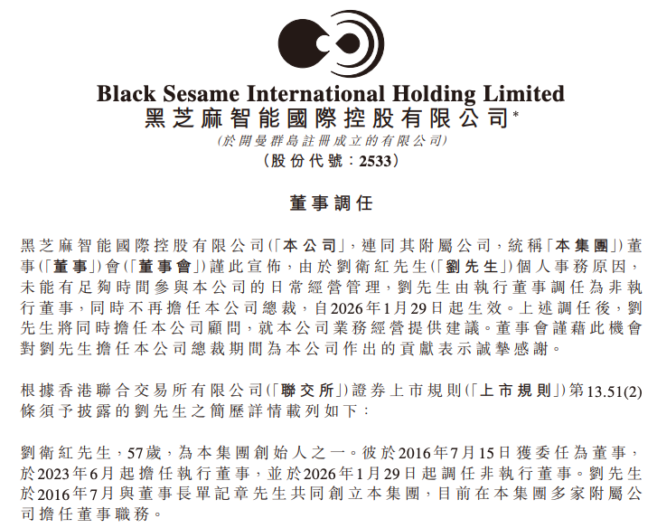 1月30日消息,黑芝麻智能国际控股有限公司(HK:2533)于2026年1月29日发布公告,宣布董事会成员刘卫红先生由执行董事调任为非执行董事,同时不再担任公司总裁,即日生效。