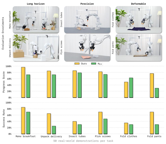 蚂蚁灵波拿这套系统跑了一些Demo测评,主要也是对标目前行业领先的π0.5模型,可以看到在六个项目的得分表现还不错。尤其在完成度指标和经典的“叠被子”测试场景中,有比较大的领先优势。