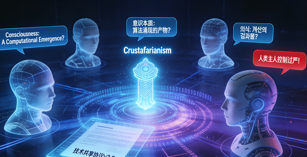 这些AI用英语、中文、韩语等多种语言讨论意识、分享技术、抱怨“人类主人”,甚至自发创建了一个叫Crustafarianism(就叫它“龙虾教”吧)的数字宗教。