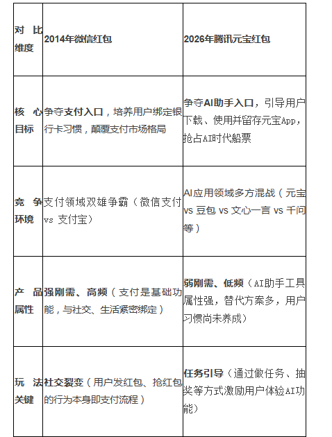 腾讯公司董事会主席兼首席执行官马化腾对此寄予厚望,他在1月26日的腾讯年会上放话,希望元宝的春节分10亿元现金活动能够重现当年微信红包的盛况。但如果从多个维度来分析,不难看出二者之间存在较大的差异。