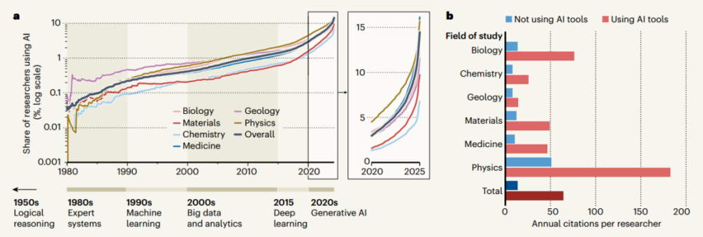 注意图1a纵坐标是对数刻度,简单说就是比例跨度太大,用这种刻度能看清从极少到极多的变化,展示了1980年到2025年,自然科学各领域(生物、化学、地质、材料、医学、物理)使用AI的科学家比例变化: