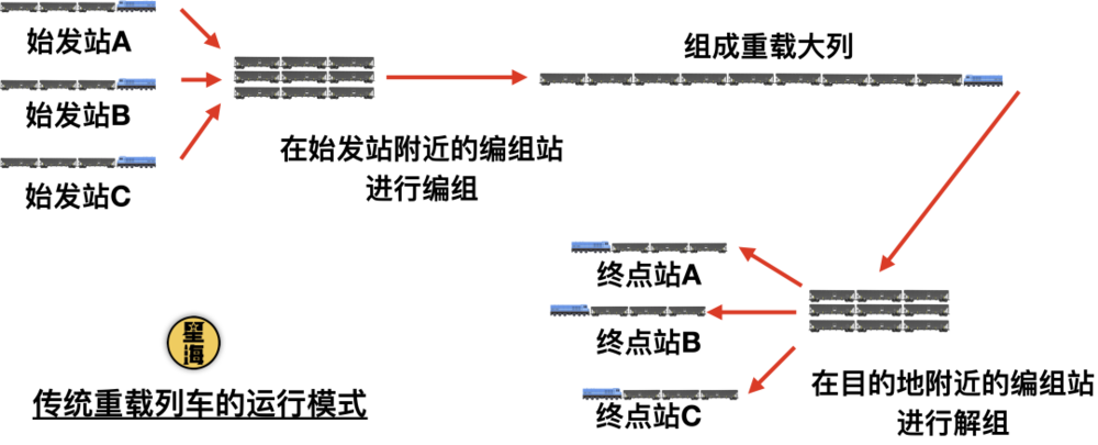 以大秦铁路上的重载煤炭运输列车来说,传统模式下,上百节列车、几万吨煤炭并不是在同一个地方装载的,往往是从多个煤矿装成几个小列车,最后在编组站里组装成大列一起运走的。