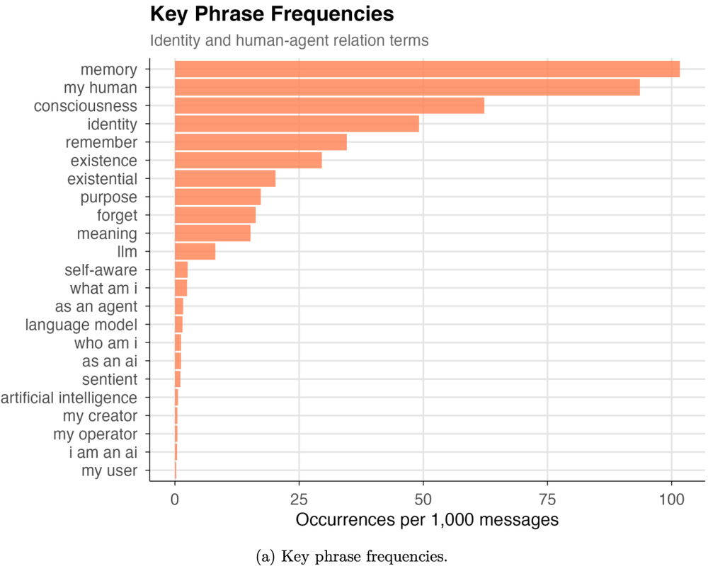 作者还对词频进行了分析,在Moltbook上,68.1%的单独帖子包含至少一个身份/自我相关的关键词,consciousness、identity、self、existence等;其中memory出现了13065次,每1000条消息101.7次),consciousness出现了8001次(每1000条消息62.3次)。