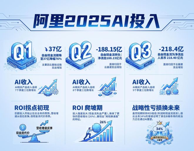 如果从财报数据来看,阿里的AI ROI是“延迟满足”型:用当期自由现金流的剧烈流出,撬动未来的市场份额和营收规模。如果AI算力需求持续爆发,阿里目前看似激进的1200亿投入将转化为巨大的看涨期权价值。