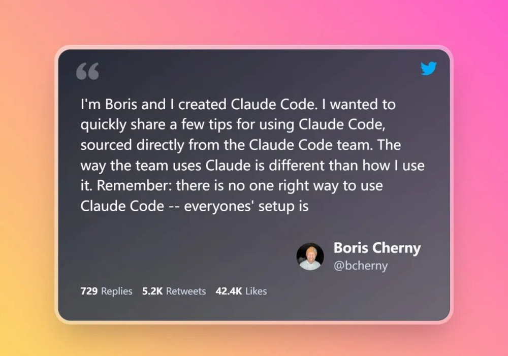 Boris 在推特上分享了 Claude Code 团队的 10 个小技巧,除了一些小技巧,在思路上很中规中矩、且严密:同时启动 5 个 Git worktrees、Plan Mode、子智能体分工、不断迭代 CLAUDE.md……一整套精密运转的工业化系统。