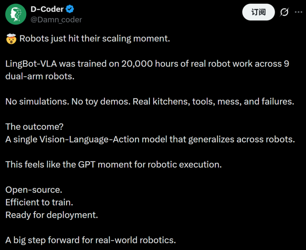 这一思路在LingBot-VLA上得到了验证。基于九种主流构型的超两万小时高质量真机数据的预训练,该模型在权威评测中超越了一系列国际顶尖基线。这项技术引发了AI社区的关注,人们认为这是现实世界机器人技术的一大进步。