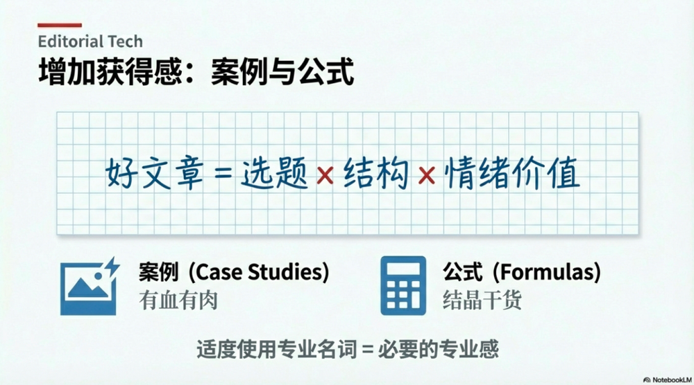 在3000字的文章里,你可以埋下5-8个专业词汇,有模型、有公式,这些词会让用户产生一种获得感,觉得学到了新东西。