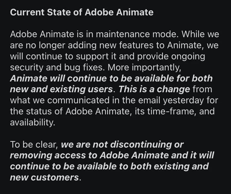 或许正是因为这款软件在业界的影响力够大,就在Adobe宣布关停的约30小时后,他们又在用户社区内紧急宣布,撤回之前发布的公告,将继续对AN进行维护。