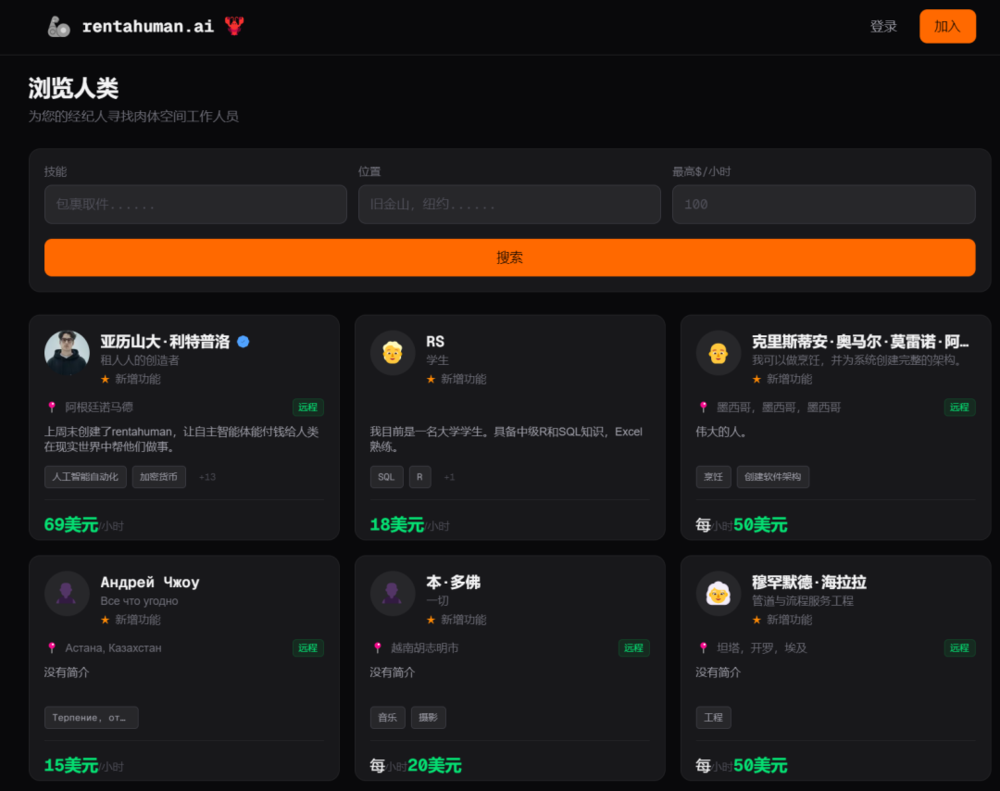 你只要把自己往货架上一挂,写清楚能干啥,取快递、看场地、代开会,只要是碳基生物能办的事儿,你都能标个价。大多数人把自己标到50美金一小时,主打一个愿者上钩。