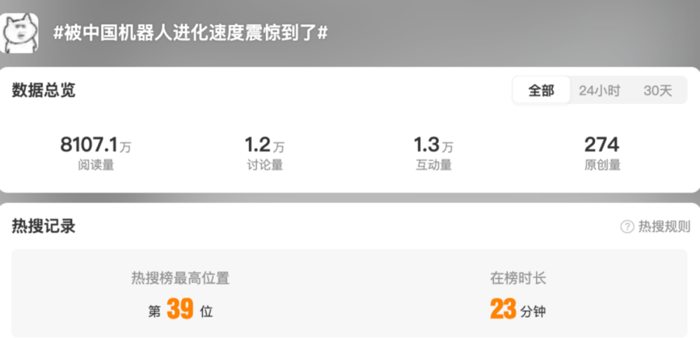 数据显示,#被中国机器人进化速度震惊到了#冲上微博热搜榜,#赛博春晚让年味更有戏#微博话题阅读量超8000w。