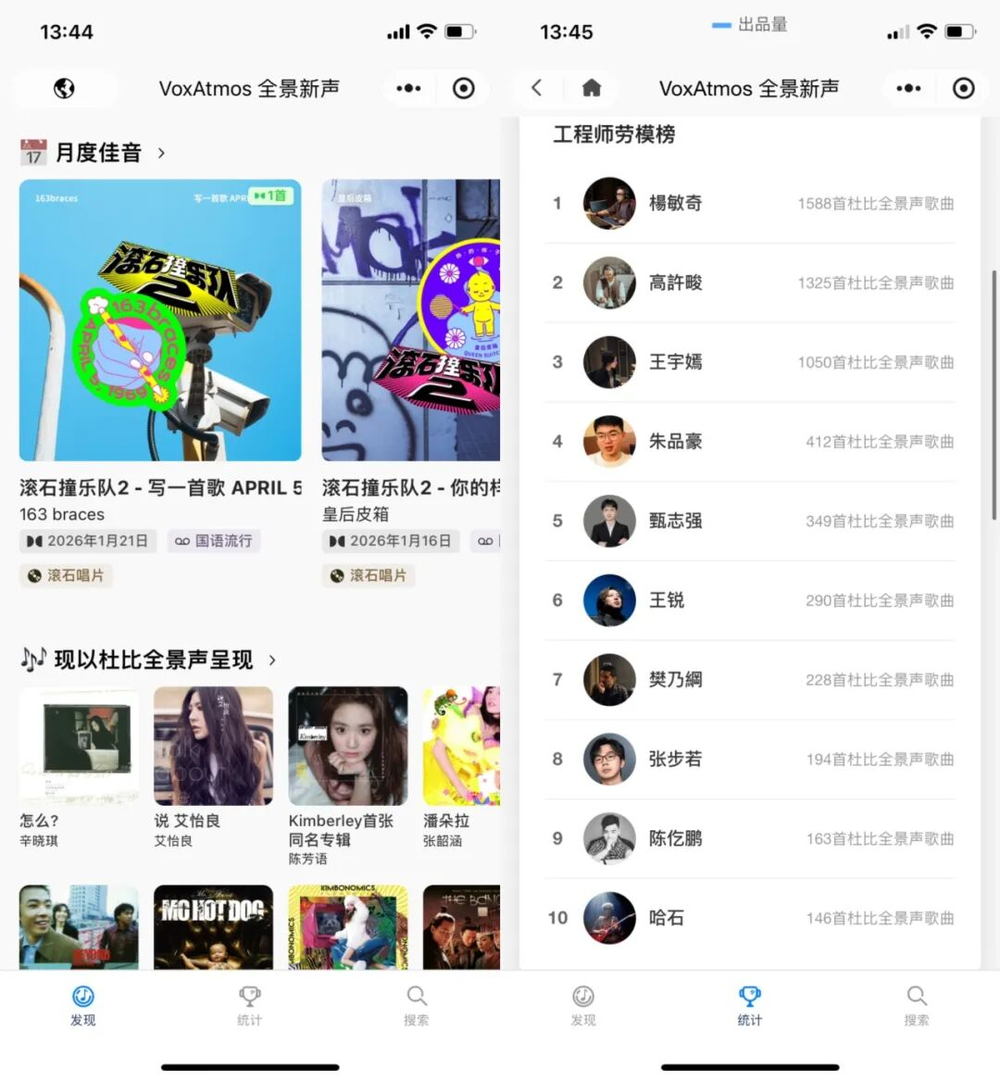 半年下来,小程序在业内圈子有不少反馈。有人用自己厂牌界面的截图去给投资人看,有混音师用全景新声数据页面去提交月报。还有人在小红书群里评价说,“匠人作品,太难得了,对杜比真的是如数家珍”,让王博源感动不已。