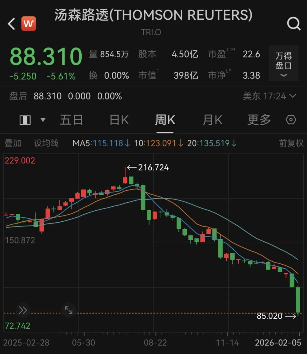 比如我比较熟悉的金融信息软件领域,领头羊汤森路透的股价已经连续五个月暴跌,接近腰斩再腰斩。还有服务法律行业的Legalzoom.com,也因为Anthropic推出了Claude Cowork的法律插件而在一天内跌了20%。