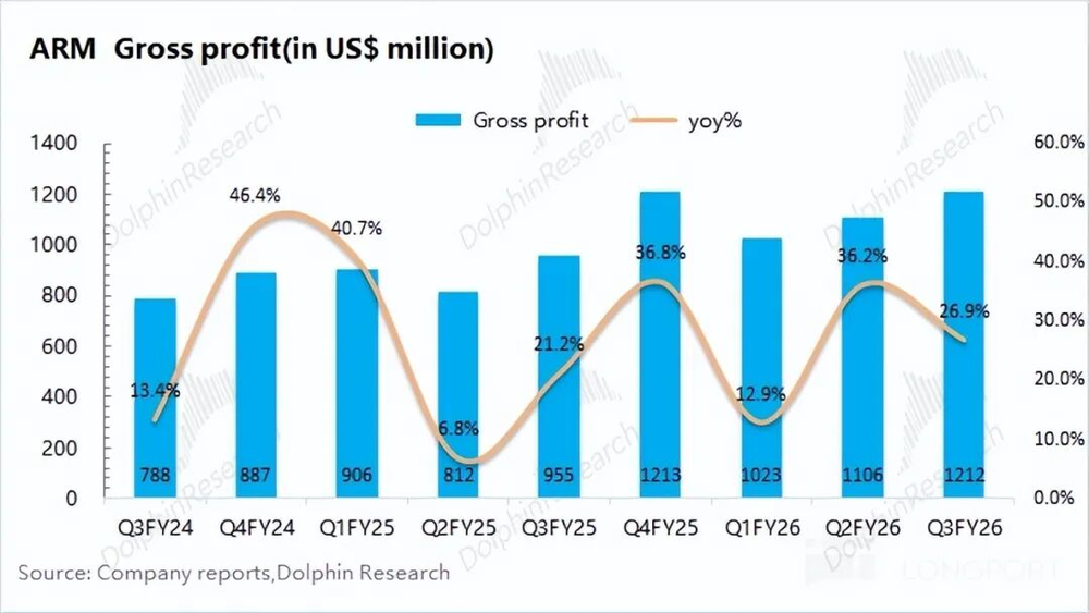 1、主要数据:Arm本季度实现收入12.4亿美元,同比增长26%,符合市场预期(12.3亿美元)。公司本季度收入端环增的1亿美元中,主要来自版税业务的增长贡献。公司毛利率为97.6%,维持在97%以上的高位。