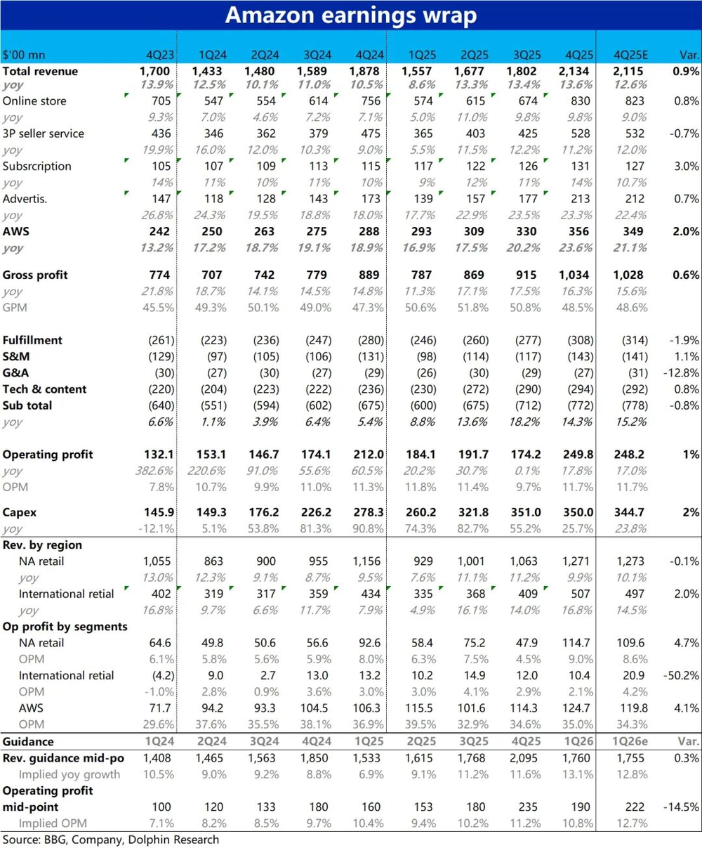 亚马逊于北京时间2月6日早美股盘后,公布了2025年4季度财报。整体来看,当季业绩表现同样不差,虽也有些瑕疵,但总收入和经营利润都略好于预期。核心AWS增速也如期显著提速,然而市场反应还是熟悉的——即便当季业绩不错,依然暴跌。具体来看: