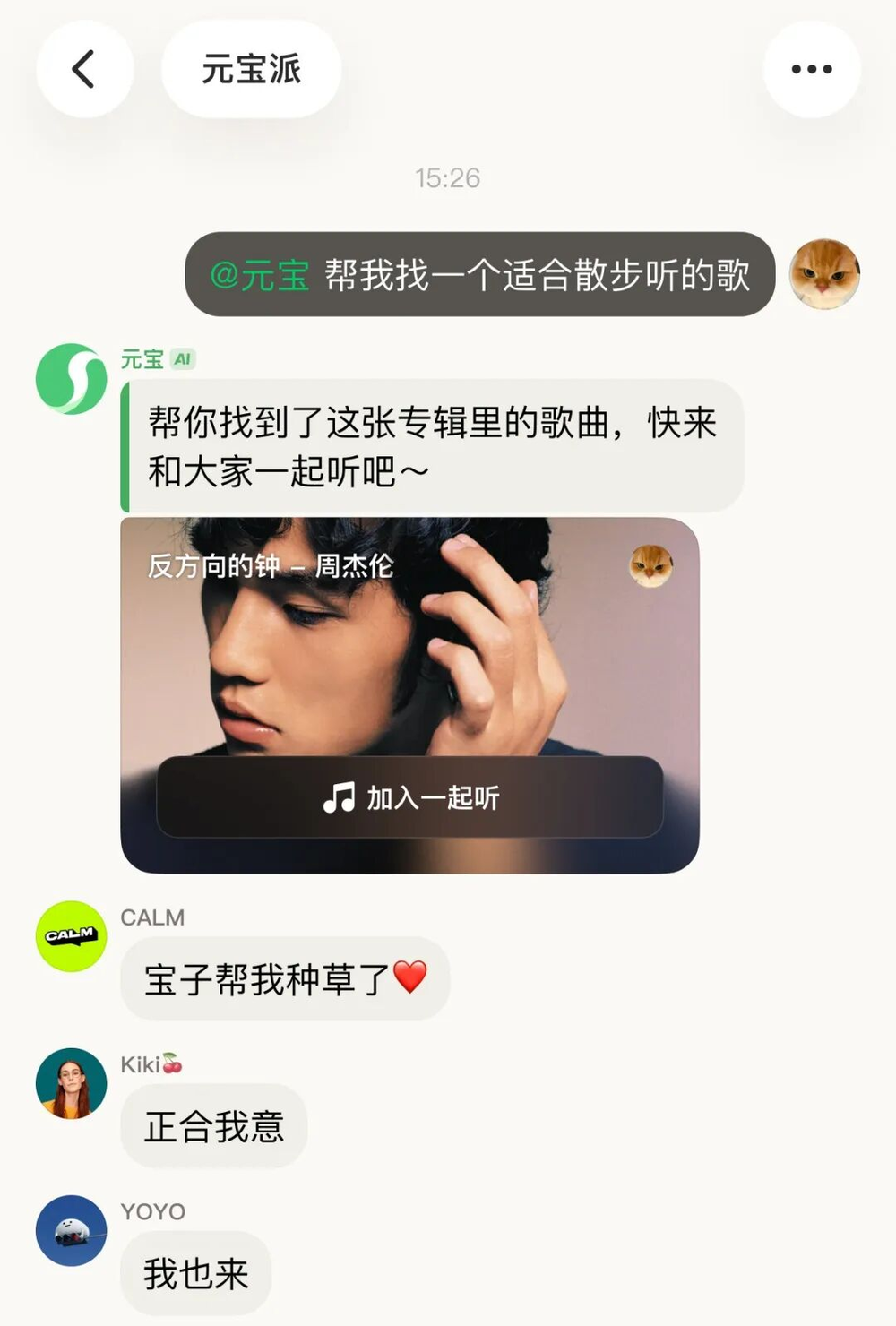 一群喜欢听歌的人,或者一群球迷。在派里,不需要切出去打开音乐软件,直接@元宝,“来首周杰伦”。