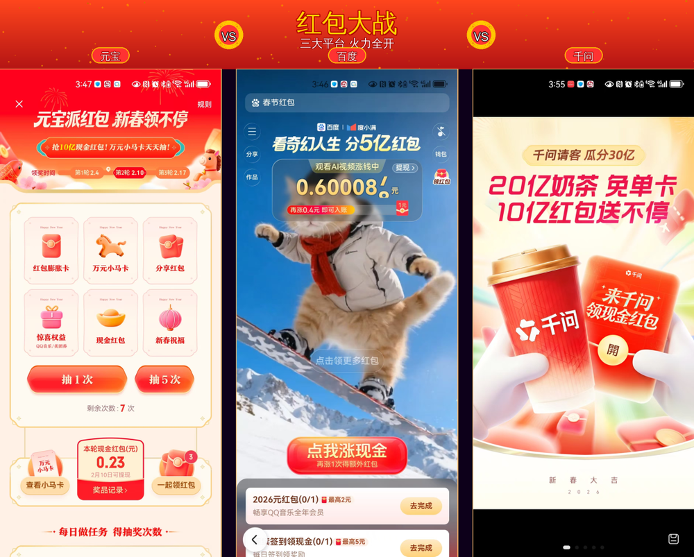 2026年马年春节未至,互联网圈的硝烟已率先点燃,这场战役不再是单纯的支付工具对决,而是AI应用争夺市场的又一次“交火”。腾讯元宝豪掷10亿现金、阿里千问砸3亿“请客”,百度、字节跳动紧随其后,四大巨头短短数日在红包大战中的投入已超45亿元。