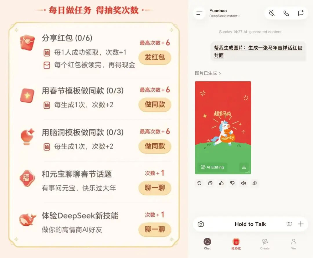用户可以通过完成任务,获取元宝的抽奖次数,任务形式有分享红包,用元宝或者DeepSeek聊天、生成图像等,一天共有超过25次的抽奖机会。