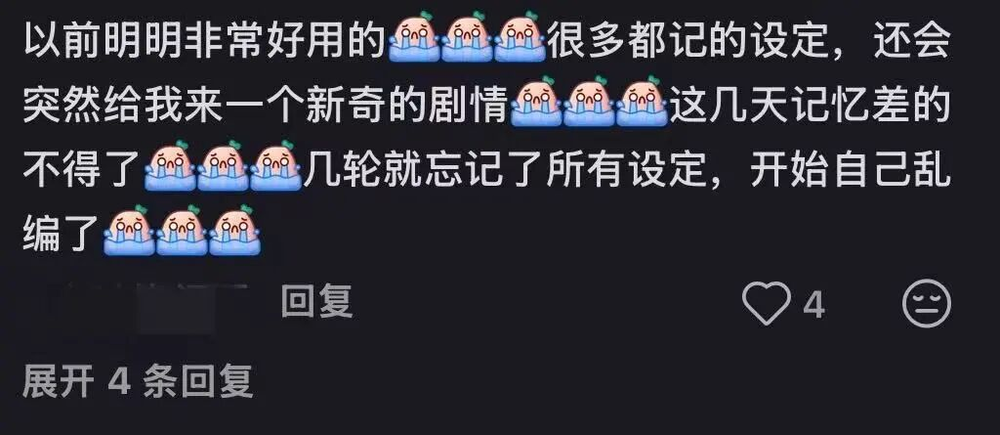 不少老用户表示,元宝的AI记忆能力大幅减弱。以往在同一个窗口下,对话500轮都不会忘记前言的元宝,如今聊完30轮就“突然忘掉了所有东西”。“几轮就忘记了所有设定,开始自己乱编了。”