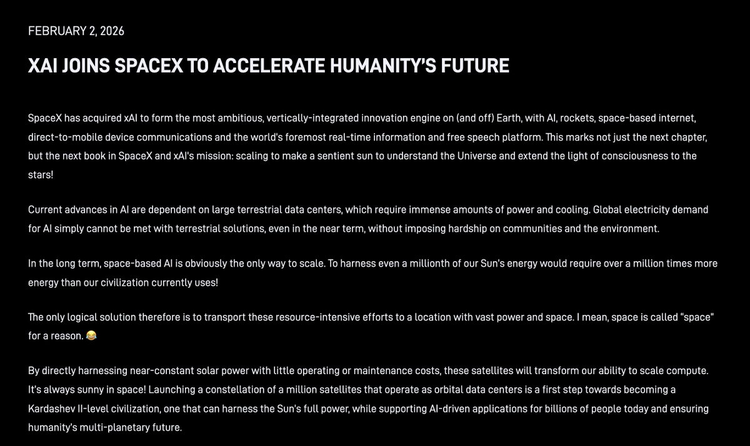 发射一个由100万颗卫星组成的星座,使其作为轨道数据中心运行,这是迈向卡尔达肖夫Ⅱ型文明的第一步。这个文明能够利用太阳的全部能量,同时为当今数十亿人提供AI驱动的应用支持,并保障人类的多行星未来。——埃隆·马斯克,《xAI并入SpaceX,加速人类未来进程》