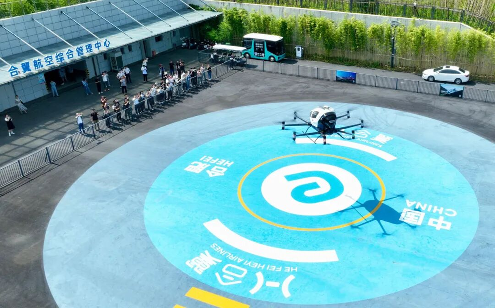 一架电动垂直起降飞行器(eVTOL)在合肥骆岗公园演示飞行。资料照片