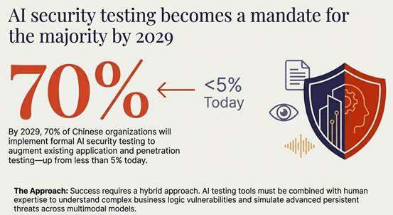 如果说国产芯片是“硬件自主”的硬指标,那么AI安全则是企业规模化应用AI的“软门槛”。Gartner预测,到2029年,70%的中国企业将实施AI安全测试,作为现有应用安全测试和渗透测试的补充,而目前这一比例还不到5%。